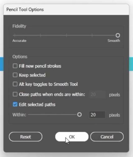 이때는 펜슬 툴을 선택한 뒤, 펜슬 옵션 창에서 <Edit selected paths>를 클릭하고, 펜슬 툴로 연결하면 자연스럽게 연결할 수 있습니다.