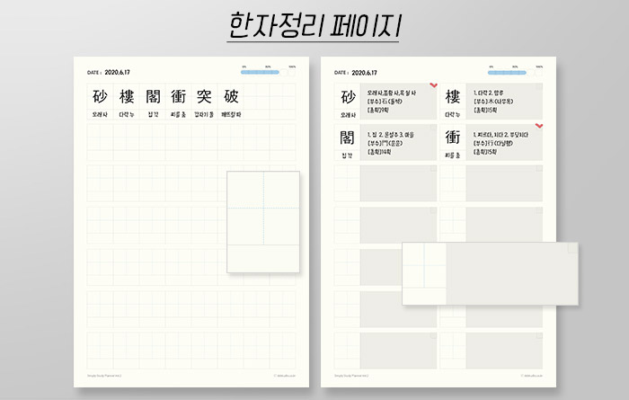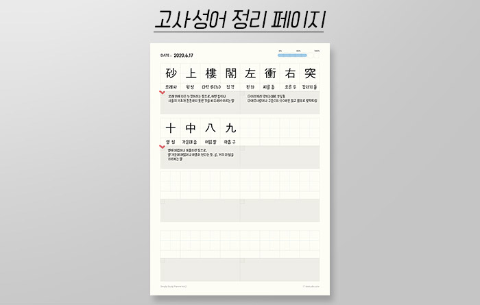 표지 1, 목표&목차 페이지 1, 한자쓰기 2, 고사성어 1, 프리노트 1로 구성되었습니다. 한자용 플래너라 한자 시험 외에도 중국어나 일본어 공부할 때도 사용할 수 있습니다.